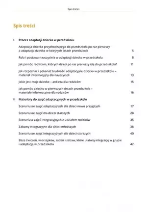 Oprócz ogólnych wiadomości i rad, opracowanie zawiera wiele propozycji zajęć grupowych i indywidualnych sprzyjających adaptacji i integracji przedszkolaka z nowym otoczeniem. Każdy scenariusz zajęć integracyjnych w przedszkolu uwzględnia opis pomocy dydaktycznych, formy zajęć, ilość osób w grupie i cele, jakie ma za zadanie osiągnąć. Jest to niezwykle pomocne dla nauczyciela/ wychowawcy przedszkolnego, który chce zadbać o komfort psychiczno-emocjonalny wszystkich swoich wychowanków i sprawnie prowadzić zajęcia.