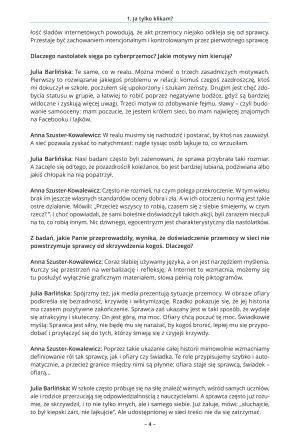 Julia Barlińska: Sprawca cyberprzemocy zaś czuje się bezkarny i bezpieczny, bo ma poczucie nieidentyfikalności. Wprawdzie fałszywe, bo dziś można namierzyć sprawcę, gdy przemoc przybiera skrajną formę. Ale sprawca nie myśli o tym w momencie klikania…