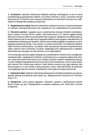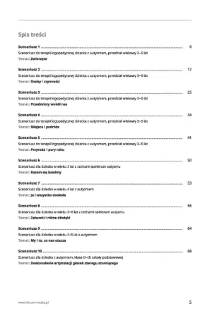 Książka zawiera 10 scenariuszy zajęć: 5 dla dzieci w przedziale wiekowym 3-5 lat, 1 dla 3-latków, 1 dla 4-latków, 2 dla dzieci w wieku 5-6 lat i 1 dla dzieci w II-III klasie szkoły podstawowej.