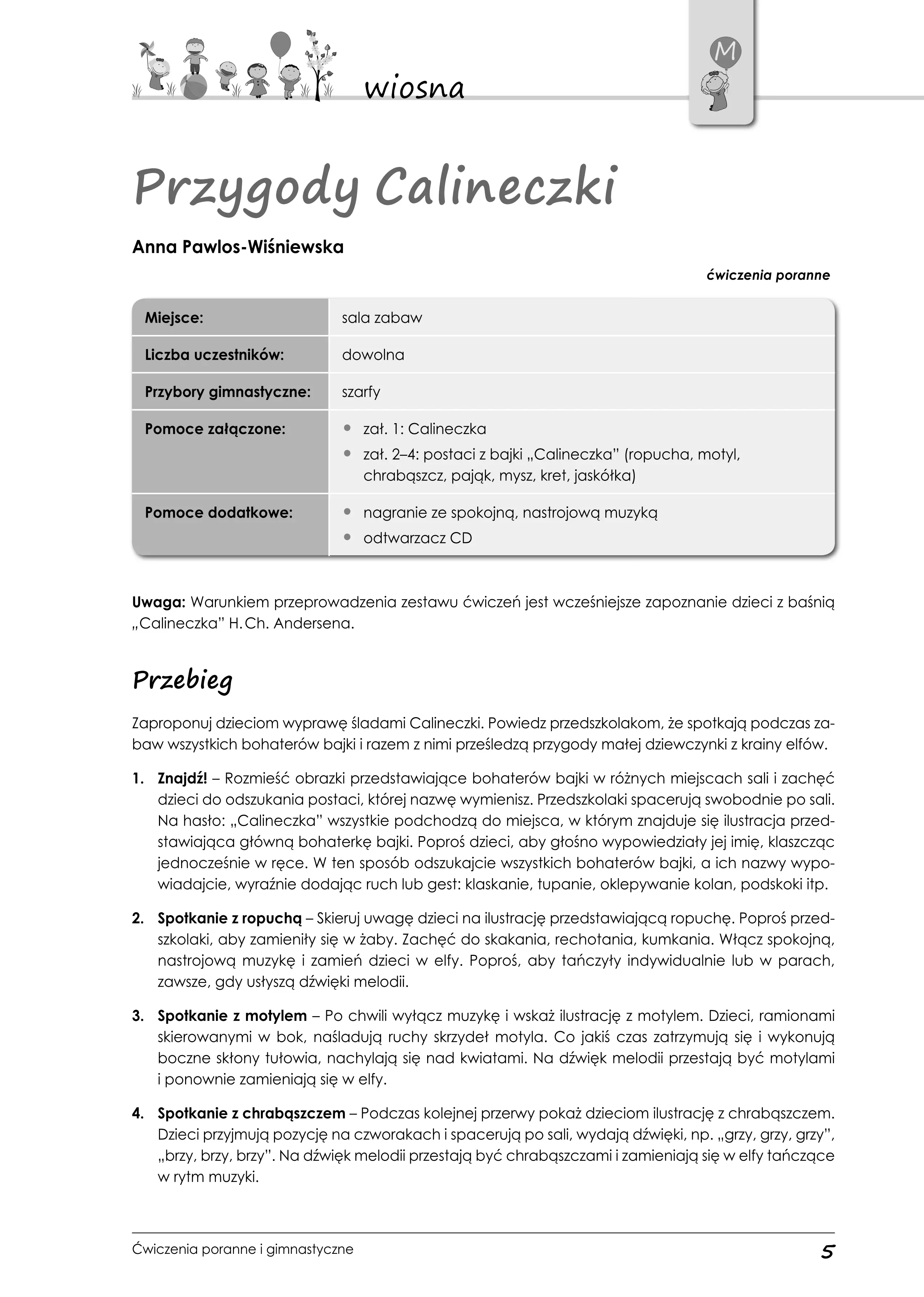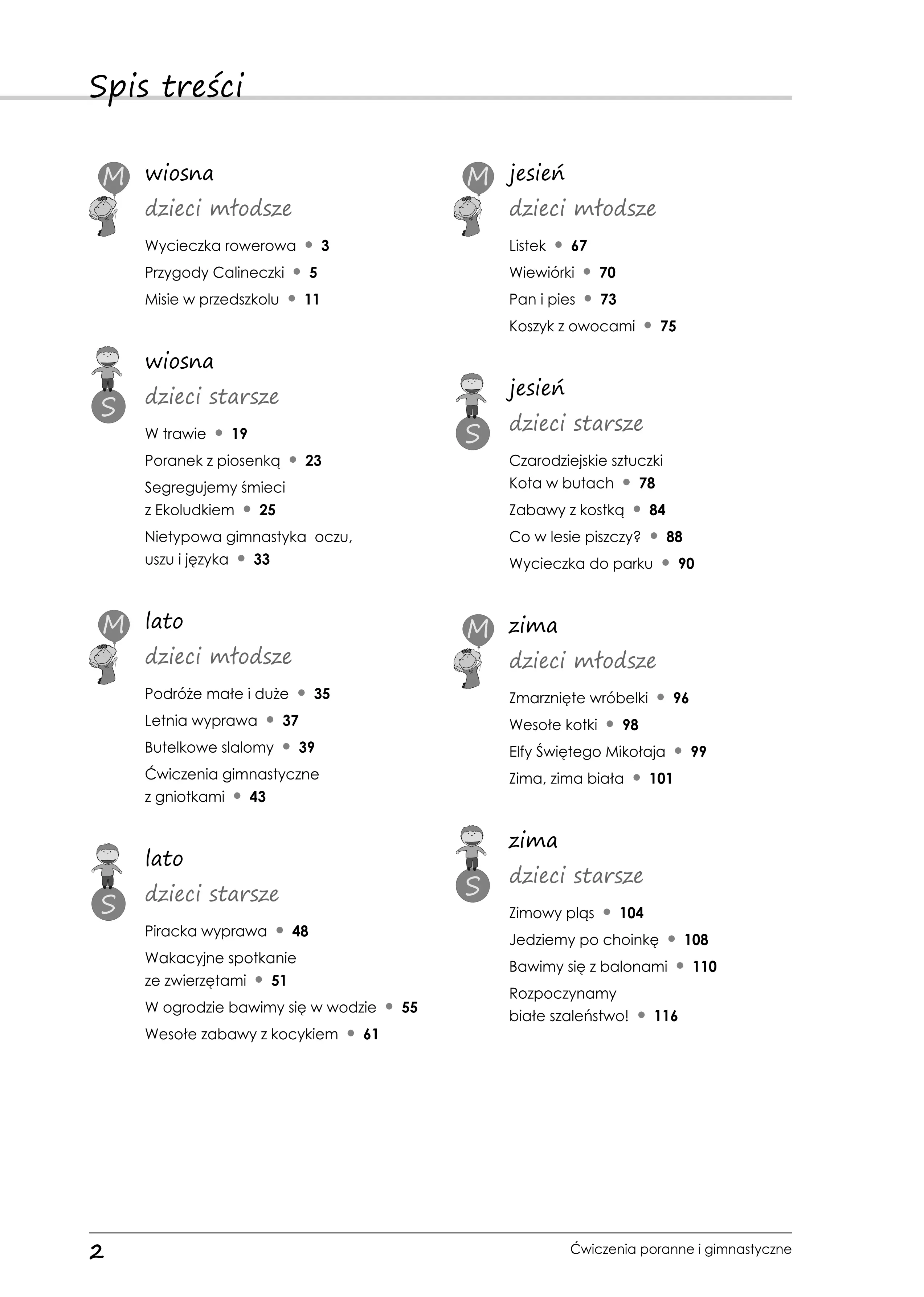 Niniejsze opracowanie to istna skarbnica gotowych pomysłów, które nie tylko uatrakcyjnią Twoje zajęcia, ale przyczynią się do poprawnej postawy ciała dzieci i pobudzą ich sympatię do zdrowego trybu życia. Każda karta na samym początku określa miejsce ćwiczeń, niezbędne narzędzia i dokładny opis wzbogacony ilustracjami poglądowymi. Niezwykle pomocne jest uwzględnianie pór roku w poszczególnych zabawach, dzięki czemu cały rok szkolny pod względem ćwiczeń przebiegnie harmonijnie i zróżnicowanie.