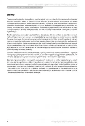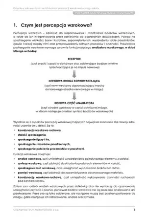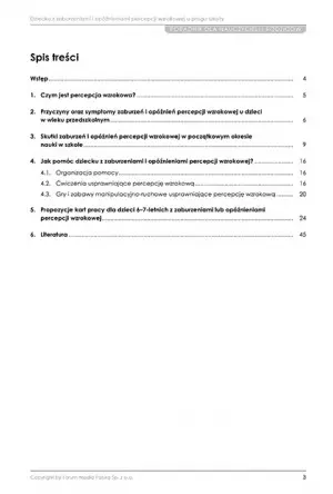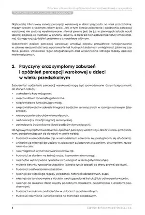Ponadto w pozycji znajdziesz przykłady prac dzieci, które wyraźnie wskazują na zaburzenia percepcji wzrokowej, 20 kart pracy wysokiej jakości z ćwiczeniami dla dzieci w wieku 6-7 lat z zaburzeniem lub opóźnieniem percepcji wzrokowej oraz proponowaną literaturę, dzięki której możesz rozwinąć swoją wiedzę w powyższym temacie. Na końcu publikacji znajduje się również miejsce na notatki.