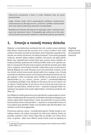 1. Emocje a rozwój mowy dziecka Małgosia z niecierpliwością oczekiwała dnia 60. urodzin swojej ukochanej babci Marysi. Narysowała dla niej duże serce z różą w środku. I choć miała zaledwie trzy latka, nauczyła się wierszyka „Jestem różyczka, wypadłam z koszyczka, nie umiem winszować, ale babcię ucałować!”. Z pewnością pragnęła ucałować, ukochać babcię małymi raczkami, tak mocno, jak tylko potrafi. Kiedy więc nadszedł dzień święta babci przy pomocy mamy założyła odświętną sukienkę, spakowała do ozdobnej torebki swoje serce i gotowa czekała na uroczystość. W dużej restauracyjnej sali zebrało się wielu gości. Były ciocie, wujkowie, starsi kuzyni i kuzynki. I były jakieś panie i jacyś panowie, których Małgosia nie znała. Wszyscy się do niej uśmiechali, wszyscy coś do niej mówili, jednak dziewczynka słyszała tylko bicie swojego serca. A kiedy nadszedł czas składania życzeń, ona stanęła przed ukochaną babcią i nie mogła wydobyć z siebie ani jednego słowa. Bródka jej się trzęsła, po policzku spłynęła łezka. „Je…, je…, jestem…, jestem…, jestem…” – powtórzyła kilka razy i zawstydzona pobiegła w kąt. Skuliła się tak mocno, by nic nie widzieć i nic nie słyszeć. I kiedy myślała, że już nikt na nią nie patrzy, otworzyła oczy i zobaczyła nad sobą babcię. „Chodź do mnie” – usłyszała ciepły głos babci. Natychmiast wyciągnęła małe rączki, objęła babcię i cichutko powiedziała „Ko-cham cię”. Pani Małgosia została poproszona przez dyrektorkę o poprowadzenie warsztatów metodycznych dla nauczycieli. Jesteś doświadczonym pedagogiem, posiadasz odpowiednie kompetencje i warto, byś podzieliła się swoją wiedzą.