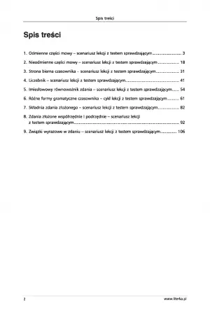 Książka zawiera takie propozycje zadań, jak: praca ze słownikiem, uzupełnianie zdań, praca z tekstem, tworzenie krótkich form pisemnych i podkreślanie w tekście części mowy.