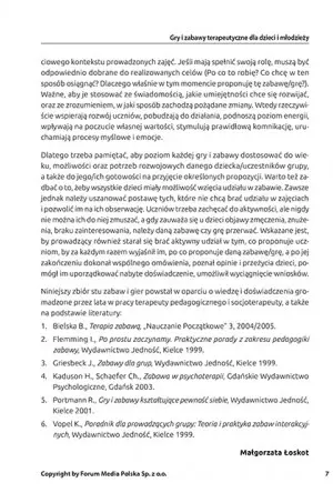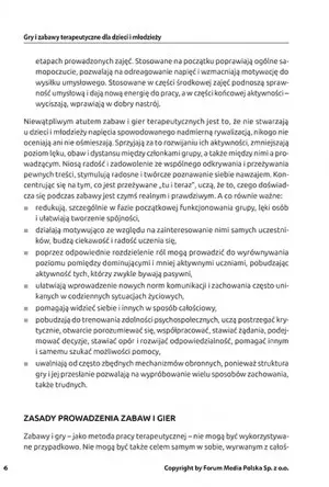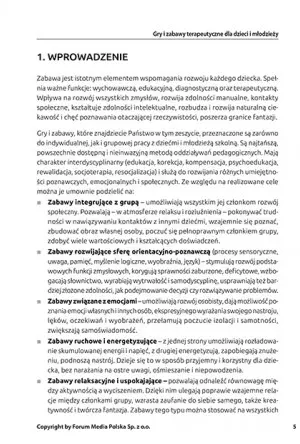 Zabawy terapeutyczne mają na celu wesprzeć rozwój dziecka. Takie właśnie zabawy znajdziesz w tej publikacji! Podzielono je na: integrujące, wspierające rozwój emocjonalny, funkcje poznawcze, zabawy ruchowe oraz relaksacyjne. Przy każdej zabawie znajdziesz jej dokładny cel, potrzebne pomoce dydaktyczne i przebieg zabawy.