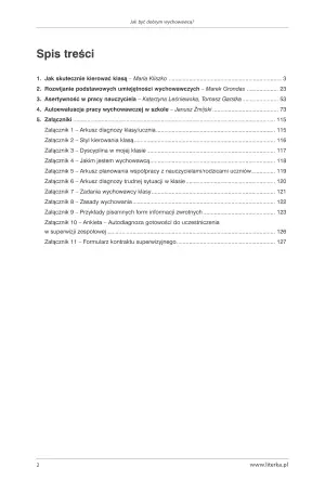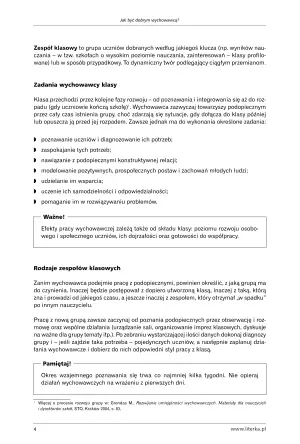 Oprócz wskazówek i rad, opracowanie zawiera ankiety samokontrolujące, dzięki czemu wychowawca może obiektywnie ocenić własną postawę i zobaczyć, co jeszcze wymaga ulepszenia pod względem podejścia pedagogicznego do uczniów. Dodatkowo książka przedstawia konkretne wytyczne i sugestie niezbędne w kontaktach z rodzicami/opiekunami uczniów oraz innymi nauczycielami. Pomaga zwracać uwagę na niepokojące symptomy wychowawcze ze strony jednostek jak i również określić główne problemy klasy jako grupy uczniów, mających wspólne podłoże środowiskowe.