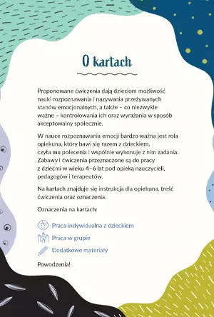 Ćwiczenia w formie miniaturowych kart zabaw gwarantują, że nuda nie wkradnie się do codziennych zajęć. Dodatkowo dzieci widząc ich krótki przekaz, są bardziej skore do zaangażowania – szczególnie jest to widoczne u dzieci nadaktywnych psychoruchowo. Kart zawierają łącznie 7 ćwiczeń/emocji, dlatego bez problemu możesz użyć ich podczas jednej zabawy, lub podzielić na każdy dzień tygodnia – wykorzystując po jednej dla lepszego przyswojenia wiedzy. Łatwo możesz je zmodyfikować i dostosować do potrzeb swoich wychowanków, co jest kluczowe w ich indywidualnym rozwoju.