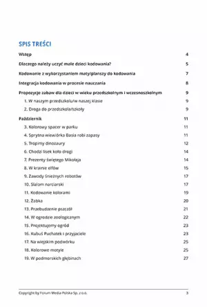 Zapewnij sobie kompleksową wiedzę i gotowe narzędzia do wprowadzenia zabaw opartych na kodowaniu w swojej grupie przedszkolnej lub wczesnoszkolnej! Dzięki naszej publikacji stworzysz inspirujące i angażujące zajęcia, które nie tylko bawią, ale także uczą ważnych umiejętności potrzebnych w dzisiejszym cyfrowym świecie.