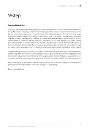 Broszura odsłania przed nami tajemnice udanej komunikacji i pokazuje, co możemy zrobić, by nabyć dodatkowe, ważne kompetencje. Poza teorią, podaną w interesujący sposób, znajdziesz w niej ćwiczenia z umiejętności negocjacyjnych, ćwiczenia dzięki którym poprawisz zdolność współpracy w grupie, podpowiedzi dla obserwatorów, a także miejsce na notatki, które wykorzystasz w dowolnym celu.