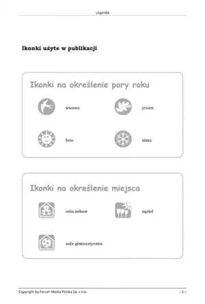 Karty ćwiczeń zawierają informacje o miejscu zajęć i ilości uczestników. Dodatkowe informacje dla nauczyciela sprzyjają efektywności lekcji, a dodatkowo podnoszą ich atrakcyjność. Mogą stanowić pomoc w zajęciach szkolnych oraz w warunkach domowych, pod kontrolą rodziców.
