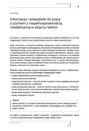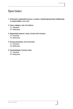 Na samym wstępie książki znajdziemy wskazówki niezbędne do pracy z uczniem z niepełnosprawnością intelektualną w stopniu lekkim. Następnie publikacja podzielona jest na cztery działy: praca z tekstem, wypowiedzi pisemne i ustne, procesy poznawcze, psychoedukacja. Każdy dział opatrzony jest odrębnymi ćwiczeniami i kartami pracy, a także wskazówkami dla nauczyciela lub terapeuty.