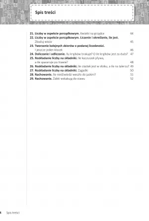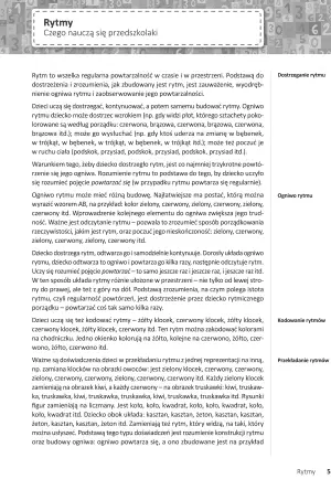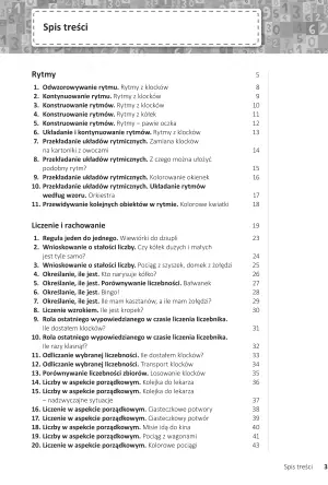 Liczne zabawy, gry i rysunki w łatwy sposób zaznajomią dziecko z podstawami matematycznymi. Każdy arkusz zawiera informację o przebiegu zajęć, jego miejscu, formie i potrzebnych materiałach niezbędnych do wykonania zadania. Dzięki takim wskazówką rodzic lub opiekun przedszkolny z łatwością przeprowadzi zajęcia matematyczne — indywidualne lub w grupie, uwzględniając poziom wiedzy dziecka, jego wiek oraz zdobyte już umiejętności.
