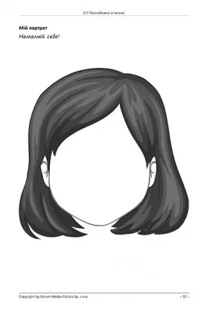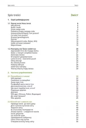 Książka zawiera 21 różnorodnych kart pracy, przetłumaczonych na język ukraiński i podzielonych na dwie części: „Poznaj mnie! Nasz świat” i „Poznajmy się! Świat wokół nas”. Wśród zadań znajdziesz między innymi: rysowanie swojego portretu, rozpoznawanie emocji „pozytywnych” i „negatywnych”, kolorowanie mapy swojego ciała, poznawanie różnych kontynentów i zwyczajów panujących w innych krajach oraz tworzenie wiejskiego krajobrazu.