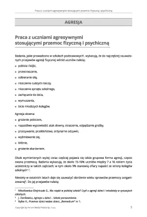W książce znajdziesz także różne sposoby podejścia do radzenia sobie z agresją w szkole, wykaz instytucji oferujących wsparcie w sytuacji wystąpienia przemocy rówieśniczej, arkusze i załączniki, które mogą być pomocne podczas zapobiegania sytuacjom problemowym, studium przypadków związanych z młodzieżą na dopalaczach i proponowaną strategię postępowania.