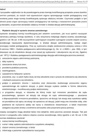 Uzyskanie akceptacji komisji kwalifikacyjnej jest ostatnim warunkiem, jaki musi spełnić nauczyciel mianowany pełniący funkcję dyrektora, w celu otrzymania kolejnego stopnia awansu zawodowego. Zgodnie z art. 9b ust. 4 KN nauczycielom spełniającym wszystkie wymagane warunki stopień awansu zawodowego nauczyciela dyplomowanego, w drodze decyzji administracyjnej, nadaje organ sprawujący nadzór pedagogiczny. Przy jej wydawaniu znajdą zastosowanie przepisy ustawy z dnia 14 czerwca 1960 r. Kodeks postępowania administracyjnego (t.j. Dz. U. z 2020 r., poz. 256), w tym odnoszące się do składników decyzji oraz zasad jej wydawania i odwoływania się od niej. Zgodnie z art. 107 § 1 Kodeksu postępowania administracyjnego decyzja administracyjna powinna zawierać: