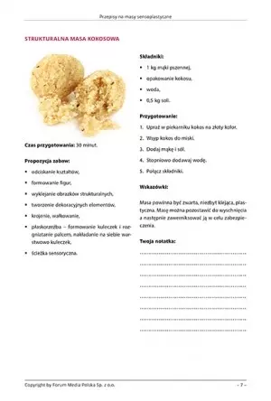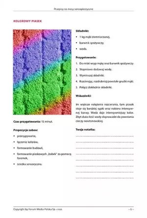 Książka zawiera 10 przepisów na masy sensoplastyczne, nadające się dla dzieci najmłodszych, w wieku przedszkolnym i dzieci w wieku wczesnoszkolnym. Każdy przepis składa się z grafiki, orientacyjnego czasu przygotowania masy sensoplastycznej, składników potrzebnych do jej wykonania, przepisu oraz wskazówek dodatkowych. Pod każdym przepisem znajduje się także miejsce na notatki, w którym możesz nanosić własne poprawki czy modyfikacje przepisu.