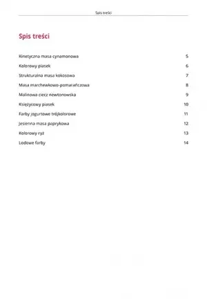 Książka zawiera 10 przepisów na masy sensoplastyczne, nadające się dla dzieci najmłodszych, w wieku przedszkolnym i dzieci w wieku wczesnoszkolnym. Każdy przepis składa się z grafiki, orientacyjnego czasu przygotowania masy sensoplastycznej, składników potrzebnych do jej wykonania, przepisu oraz wskazówek dodatkowych. Pod każdym przepisem znajduje się także miejsce na notatki, w którym możesz nanosić własne poprawki czy modyfikacje przepisu.