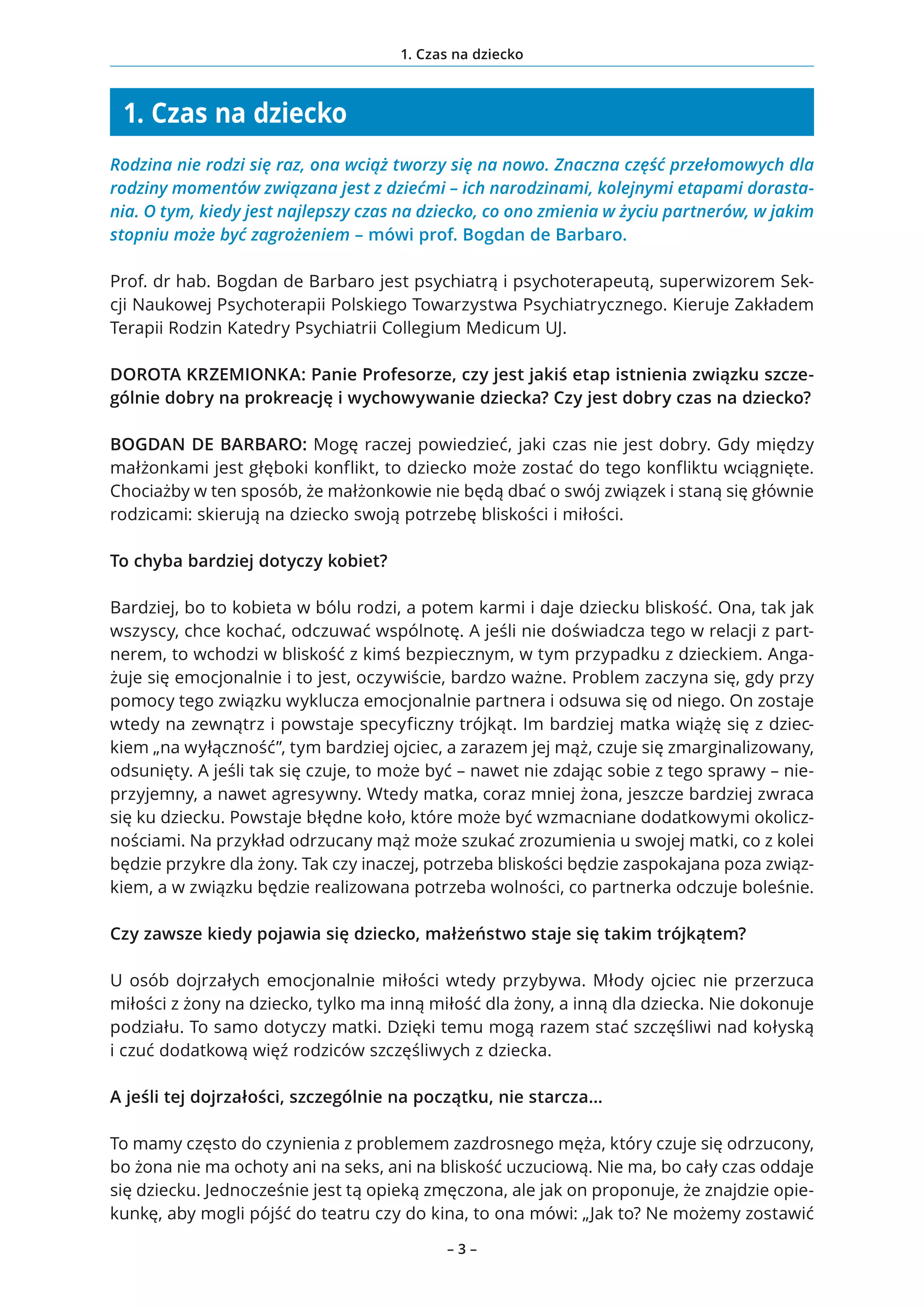 Rodzina nie rodzi się raz, ona wciąż tworzy się na nowo. Znaczna część przełomowych dla rodziny momentów związana jest z dziećmi – ich narodzinami, kolejnymi etapami dorastania. O tym, kiedy jest najlepszy czas na dziecko, co ono zmienia w życiu partnerów, w jakim stopniu może być zagrożeniem – mówi prof. Bogdan de Barbaro.