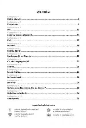 Publikacja zawiera 15 kart pracy: 3 dla niemowląt i małych dzieci, 9 dla dzieci w wieku przedszkolnym i 3 dla dzieci w wieku szkolnym. Każda karta oznaczona jest specjalnym piktogramem.