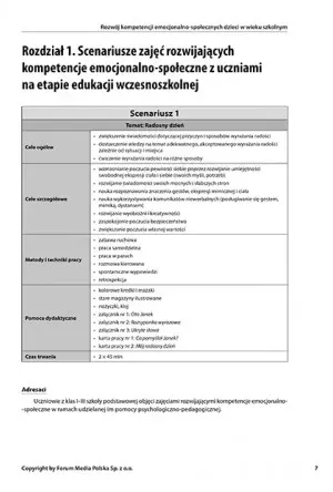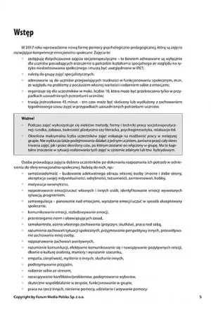Scenariusze przedstawiają cel ćwiczeń, wskazują użyte metody, czas trwania zajęć i niezbędne pomoce dydaktyczne. Dzięki temu nauczyciel może skorzystać z „gotowca”, co oszczędzi czas na długie przygotowania zajęć i wymyślanie nowych wątków (elementów) zabaw.