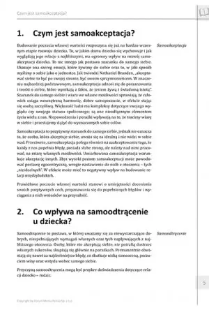Dzieci szczególnie narażone są na docinki ze strony rówieśników oraz wytykanie błędów. Mimo nauki ogólnej tolerancji i szacunku do innych, warto wyposażyć dzieci w dodatkową ochronę, która niczym tarcza, będzie je osłaniać przed “najgorszymi” trudnościami. Samoakceptacja sprawi, że dzieci staną się bardziej odporne psychicznie, a czynniki zewnętrzne nie będą w stanie długotrwale wpływać negatywnie na ich nastrój oraz rozwój emocjonalny. Takie działanie spowoduje, że zmniejszymy u nich ryzyko wystąpienia potencjalnych lęków czy depresji i wesprzemy procesy samorealizacji, które dadzą im szczęście. Scenariusze zajęć zawierają gry, bajki, wierszyki i liczne ilustracje, dzięki którym lekcje staną się dla dzieci ciekawe, atrakcyjne i zmobilizują je do pełnego zaangażowania wszystkich zmysłów.