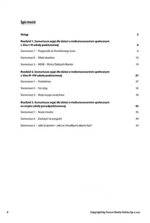 Publikacja zawiera 9 scenariuszy zajęć, po 3 dla każdego etapu: klasa I-III, klasa IV-VIII i szkoła ponadpodstawowa. W każdym scenariuszu dokładnie omówione są cele ogólne i szczegółowe zajęć, metody i techniki pracy, potrzebne pomoce dydaktyczne oraz orientacyjny czas trwania, a także formy pracy i przebieg zajęć. Zaproponowane przez autorkę ćwiczenia sprawią, że dziecko z niedostosowaniem społecznym dostrzeże swoje mocne i słabe strony, nauczy się radzić ze swoimi emocjami i rozumieć potrzeby innych, zrozumie także korzyści wynikające z przyjaźni oraz będzie potrafiło reagować w sposób prawidłowy w rozmaitych sytuacjach.