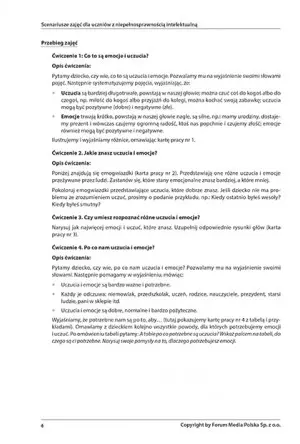 Opracowanie uwzględnia zajęcia indywidualne i grupowe. Każdy rozdział zawiera dokładne informacje dotyczące celu zajęć, ich formy oraz narzędzi edukacyjnych niezbędnych do wykonania ćwiczeń. Liczne rebusy, ilustracje i wycinanki w łatwy sposób przedstawiają i przekazują skomplikowaną wiedzę. Emocje nie są niekiedy łatwe do zdefiniowana, a osoby z niepełnosprawnością intelektualną mogą mieć z tym szczególne trudności. Scenariusze w przystępny sposób przedstawiają świat emocji, dzięki czemu dziecko bez trudu będzie w stanie zrozumieć swoje uczucia, co przełoży się na jego rozwój intelektualny.