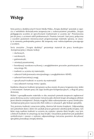 Każde polecenie jest jasno i prosto sformowane, dlatego uczeń nie będzie miał trudności z wykonaniem ćwiczeń. Ponieważ opracowanie przeznaczone jest dla dzieci szkół podstawowych, poszczególne zadania dostosowane są do trudności, jakie mogą napotkać wraz z kolejnymi etapami kształcenia. Bogate i przyjazne rysunki zachęcają do pracy, a rozmaite polecenia sprawiają, że w ich wykonywaniu nie ma miejsca na monotonię czy nudę. Jako terapeuta w opracowaniu otrzymujesz gotowy plan pracy z uczniem, co przełoży się także na komfort samego nauczania.