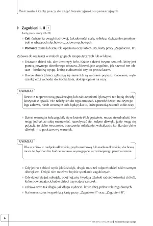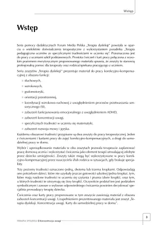Opracowanie jest niezwykle bogate w rysunki, rebusy, wycinanki i zabawy, które zdecydowanie przykują uwagę ucznia. Ze względu na swój charakter dydaktyczny, ćwiczenia podzielono zgodnie z predyspozycjami trudności – dzięki czemu można kontrolować postępy ucznia lub dostrzec ewentualne braki wymagające dalszego treningu. Zadania są sformułowane w sposób niezwykle prosty i przystępny, dzięki czemu uczeń nie nabywa tylko umiejętności koncentracji, ale śmiało może w pełni zrozumieć polecenie podczas samodzielnej pracy pod okiem terapeuty. Zadania nie są czasochłonne, a mają charakter krótkiego treningu, dzięki czemu dziecko wykona je z przyjemnością i zaangażowaniem, a nie znudzeniem czy niecierpliwością.