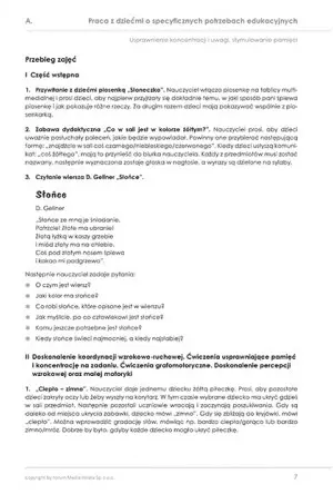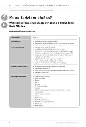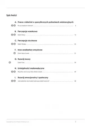 Scenariusze zajęć zawarte w pozycji to coś więcej niż zwykłe ćwiczenia wspierające. To kompleksowy zestaw zadań, które przede wszystkim mają być atrakcyjne dla dziecka i łatwe do realizacji podczas zajęć. Forma zabaw z wykorzystaniem kolorowanek, wycinanek czy radosnych rymowanek wpływa na zaangażowanie dziecka i przyczynia się do szybszych postępów. Dzieci nie traktują proponowanych ćwiczeń jak zadań terapeutycznych, a możliwość udanego spędzania czasu. Ich odpowiednie podejście, znacząco podniesie efektywność terapii i ułatwi specjalistom/pedagogom realizację toku nauczania.