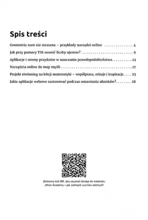 Pakiet zawiera pełen instruktaż dla nauczyciela w postaci prezentacji, a także materiału wideo Khan Academy – jak zachęcić uczniów zdolnych? Dzięki temu wprowadzenie udogodnień technologicznych nie będzie trudne, a KOD QR momentalnie przeniesie nas na potrzebny adres internetowy. Autorzy naprawdę pragną nie tylko ułatwić nowoczesną modernizację metod nauczania, lecz także sprawić, aby praca nauczyciela była łatwiejsza, przyjemniejsza i znacznie bardziej satysfakcjonująca.