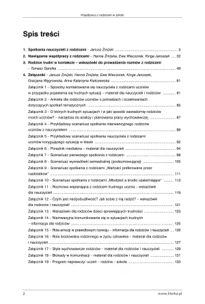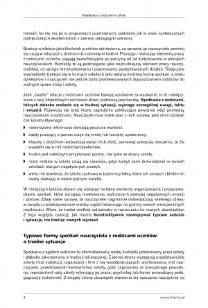 Poza tym opracowania zawierają informację jak zrobić dobre „pierwsze wrażenie” i wzbudzić zaufanie rodziców do wychowawcy. To niezwykle ważne, gdyż rzutuje na całorocznej współpracy z rodzicami lub opiekunami ucznia. Znajdziemy tu również przykłady planu wychowawczego, który w uporządkowany sposób pomoże dążyć nauczycielom do realizacji celów pedagogiczno-edukacyjnych oraz wskazówki jak długo powinny trwać poszczególne etapy harmonogramu podczas wywiadówki.