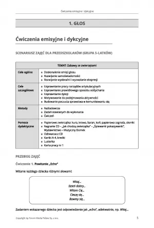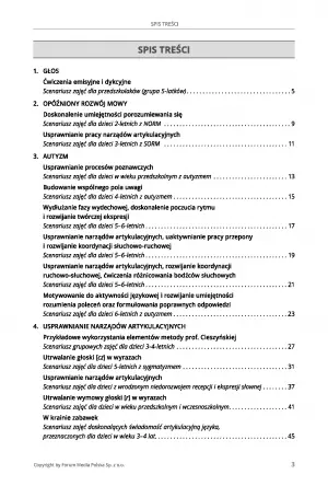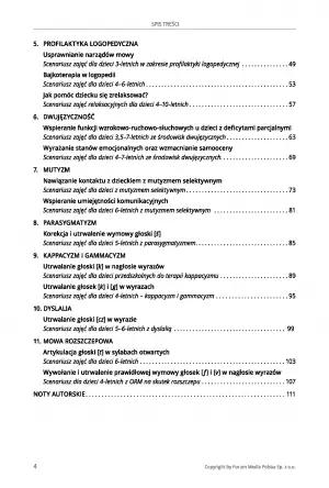 Pozycja zawiera aż 27 scenariuszy zajęć napisanych pod dzieci mierzące się z różnymi problemami związanymi z mową, jak: opóźniony rozwój mowy, mutyzm, parasygmatyzm lub dyslalię. Każdy z nich jest dokładnie opisany, także pod kątem przygotowania pomocy dydaktycznych.