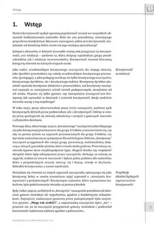 E-wydanie zawiera urozmaicone scenariusze zajęć, które staną się praktycznym narzędziem rozwijającym kreatywność dzieci. Nauczyciel już na samym wstępie ma przedstawiony główny cel ćwiczeń, metodę działania i pomoce dydaktyczne, co sprzyja jego dobremu przygotowaniu się do lekcji. Dodatkowo prezentowane scenariusze dbają o rozwijanie innych elementów wspierających kreatywność tj. rozbudzanie wiary we własne możliwości, myślenia dedukcyjnego i ciekawości poznawczej.