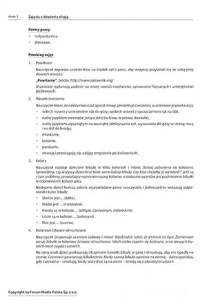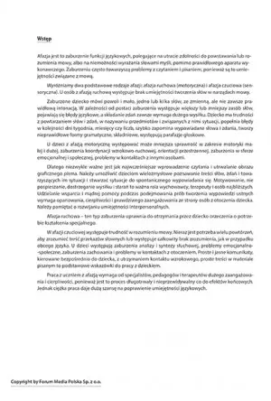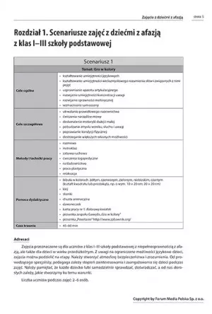 Każdy ze scenariuszy zawiera opis celu, metody wykorzystanej w schemacie, narzędzia dydaktyczne oraz czas trwania zajęć. Stanowią one podstawę prowadzenia zajęć, ale pozwalają na dowolną modyfikację, która przyczyni się do indywidualnego rozwoju ucznia. Opracowanie zawiera atrakcyjne rysunki, piktogramy oraz ilustrację, które ożywią każde zajęcia i zachęcą dziecko z afazją do pełnego zaangażowania.