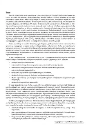 Każdy ze scenariuszy zawiera opis celu, metody wykorzystanej w schemacie, niezbędne pomoce i narzędzia dydaktyczne oraz czas trwania zajęć. Pomoże Ci to maksymalnie zwiększyć efektywność swoich zajęć i zapewnić ich odpowiedni odbiór. Ponieważ osoby cierpiące na zaburzenia słuchu często się dekoncentrują, scenariusze są niezwykle zróżnicowane i angażujące uwagę ucznia słabosłyszącego, by ten nie odczuwał monotonii zajęć.
