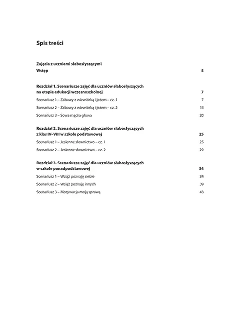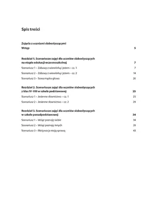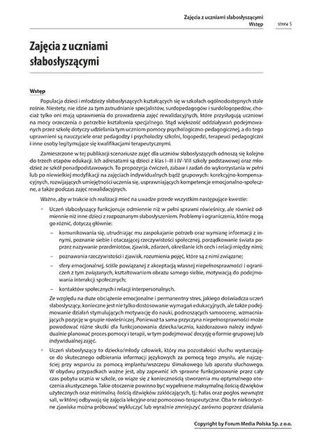 Zamieszczone w tej publikacji scenariusze zajęć dla uczniów słabosłyszących odnoszą się kolejno do trzech etapów edukacji. Ich adresatami są dzieci z klas I–III i IV–VIII szkoły podstawowej oraz młodzież ze szkół ponadpodstawowych. To propozycja ćwiczeń, zabaw i zadań do wykorzystania w pełni