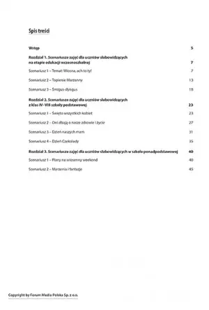 Publikacja zawiera 9 rozbudowanych scenariuszy zajęć dla uczniów słabowidzących: 3 dla dzieci na etapie edukacji wczesnoszkolnej, 4 dla uczniów na etapie edukacji szkolnej i 2 dla etapu szkoły ponadpodstawowej. Zadania zawarte w scenariuszach zajęć pomagają w ćwiczeniu analizy i syntezy wzrokowej, rozwijaniu procesów myślenia w oparciu o materiał wzrokowy, zwiększaniu poczucia własnej wartości, zaspokajaniu podstawowych potrzeb związanych z bezpieczeństwem, kształtowaniu koncentracji i wyobraźni oraz rozwoju zdolności krytycznego myślenia