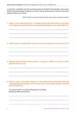 Dodatkowo przy niektórych pytaniach uwzględniono punktację, która wskaże uczniowi ewentualne braki, swojej dedukcji lub innych elementów konstruujących wypowiedź. Zróżnicowane tematy i formy literackie znacznie uatrakcyjniają odbiór treści, a także przygotowują ucznia na każdy prawdopodobny scenariusz, jaki może pojawić się na egzaminie dojrzałości.